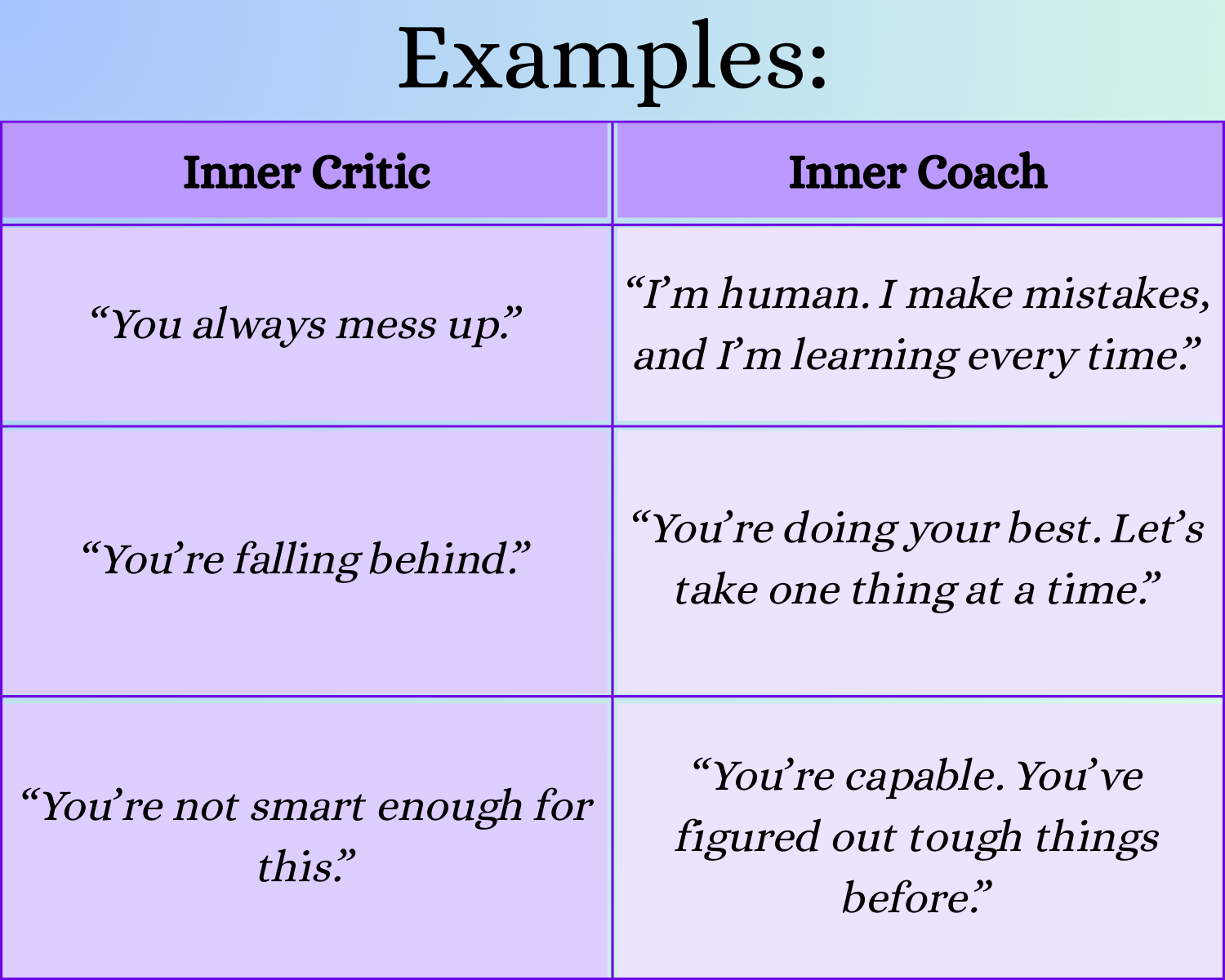 The Inner Coach, in contrast, is kind, encouraging, and grounded in self-compassion and accountability.