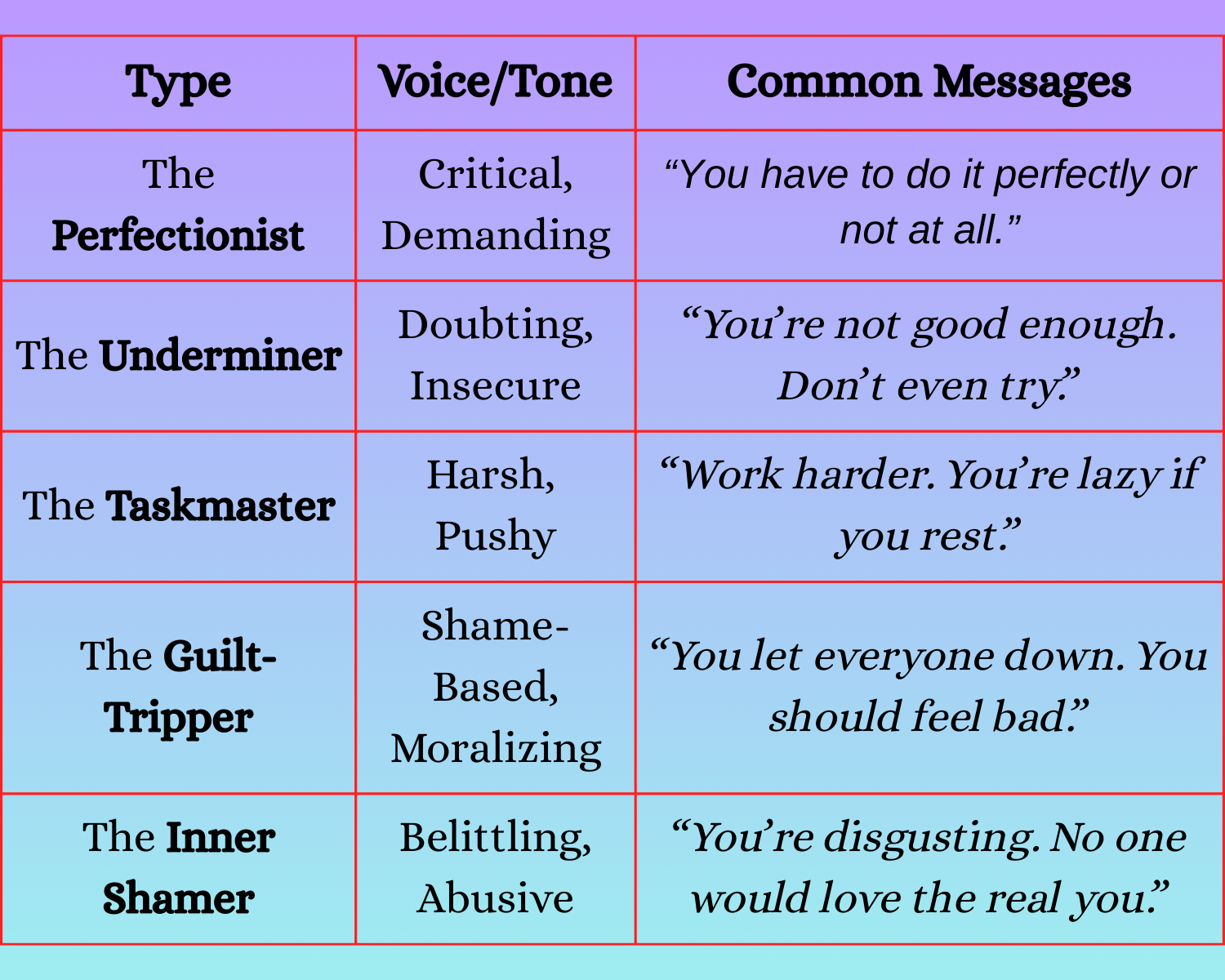 The Inner Critic is harsh, perfectionistic, shaming, and/or fearful. It often mimics the voices of early caregivers, teachers, or cultural messages.
